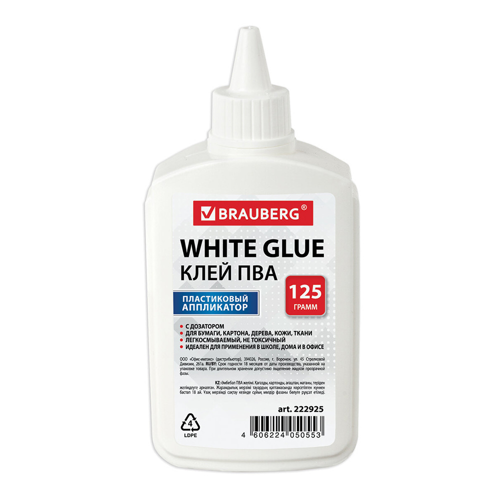 Клей ПВА Brauberg 222925 для бумаги, картона, дерева, с дозатором, 125 г