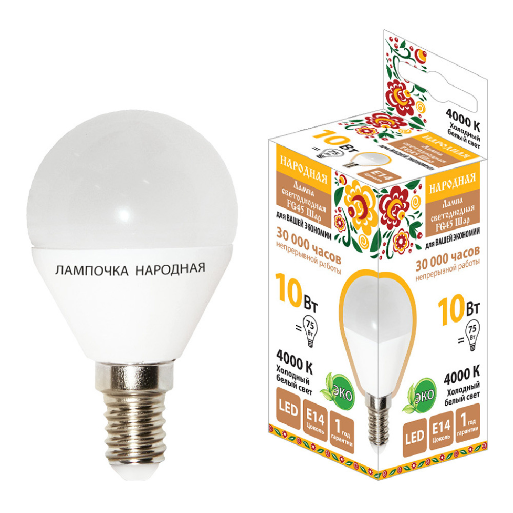 Лампа светодиодная TDM Народная 10Вт-230В-4000К–E14 шар