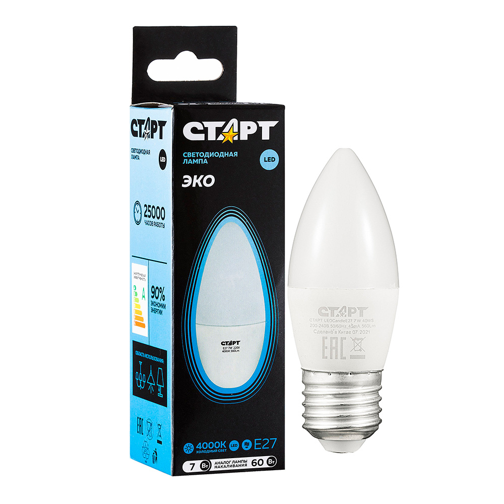 Лампа светодиодная Старт ECO, E27, 7 Вт, 4000 K, холодный свет, Свеча