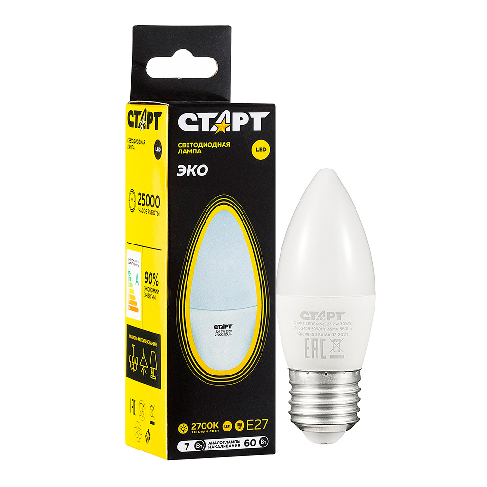 Лампа светодиодная Старт ECO, E27, 7 Вт, 2700 K, теплый свет, Свеча