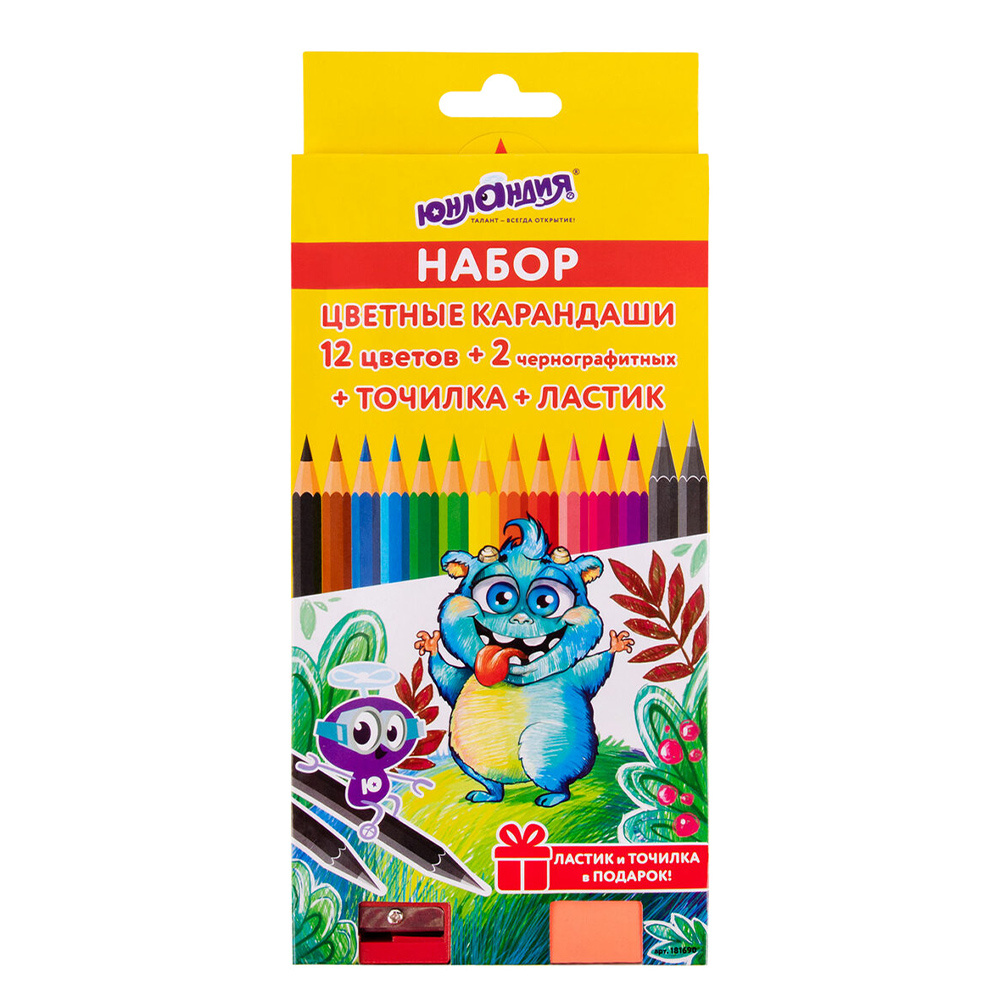 Карандаши цветные Юнландия 181690 Монстрик, ластик, точилка, 2 чернографитных, 12 цветов
