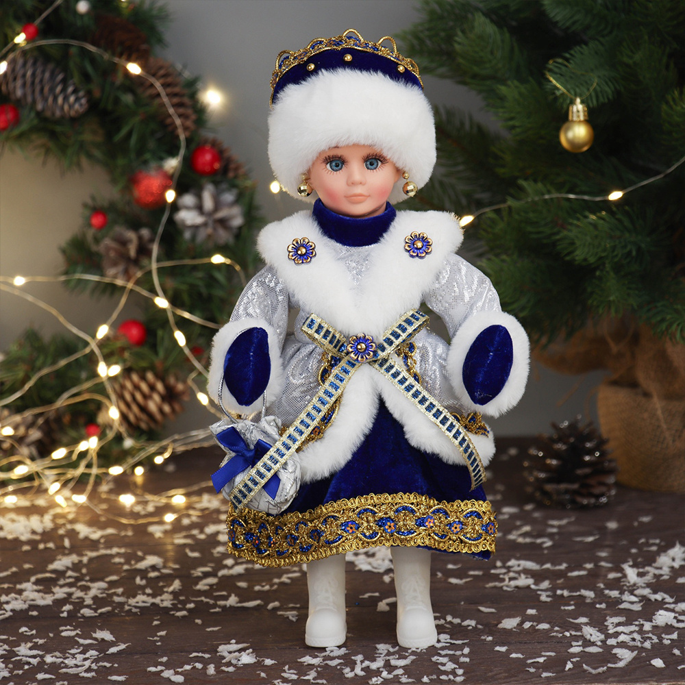 Новогодняя Игрушка Снегурочка 7856834 В меховом жилете с брошами,длинное платье 30 см, серебристо-синий