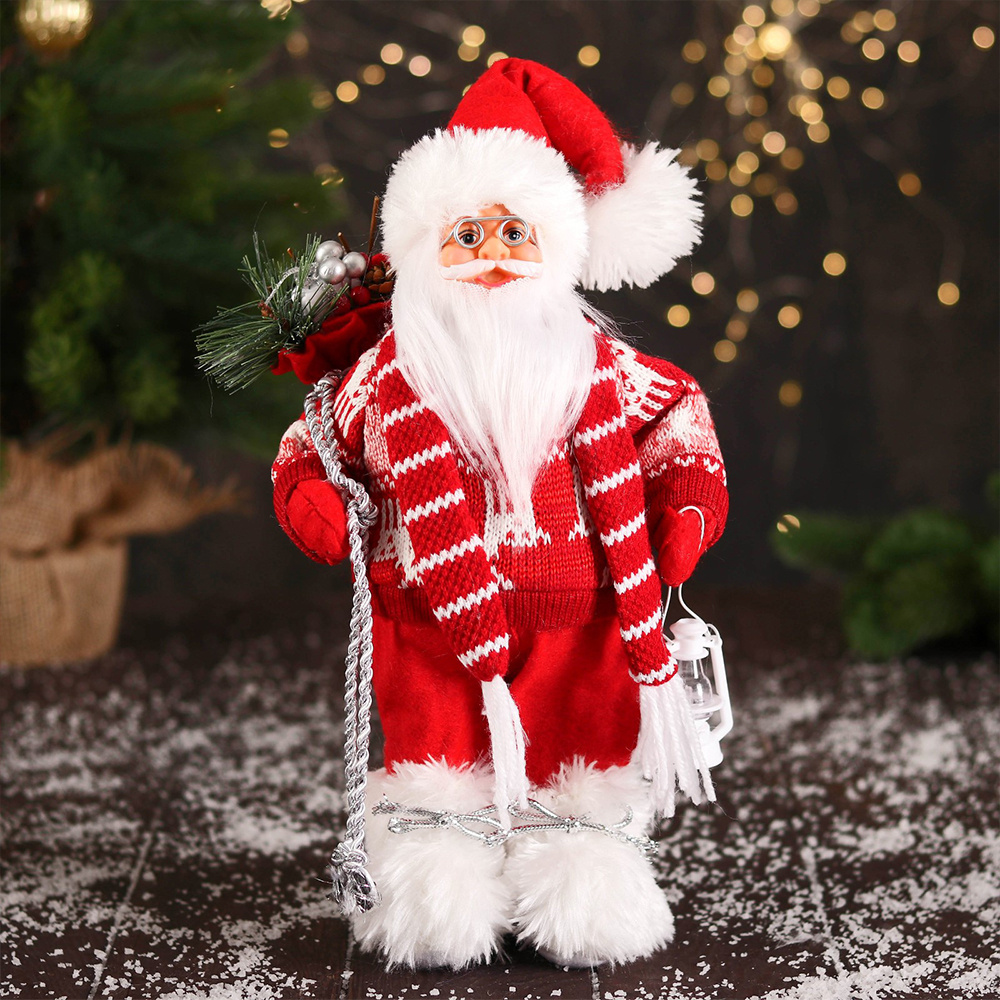 НГ Игр.Дед Мороз 7856746 В свитере с оленями и с фонариком 30 см, бело-красный
