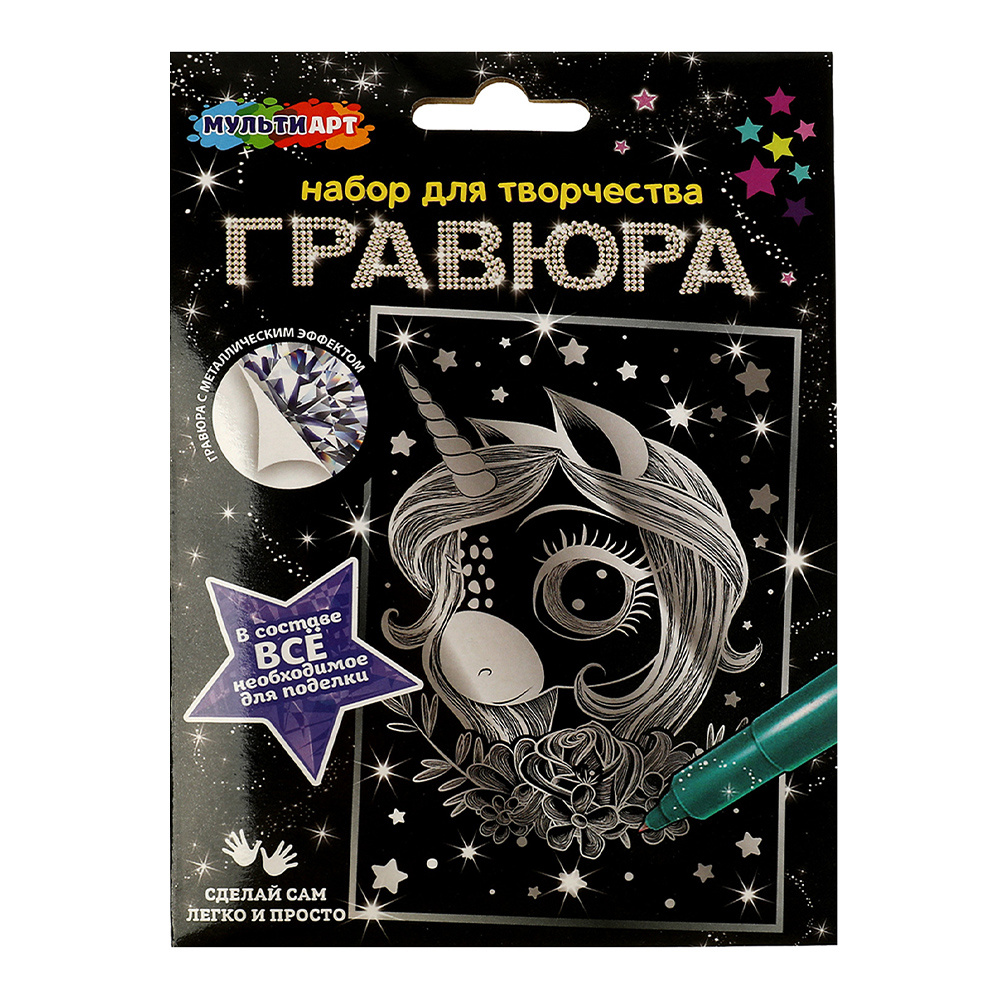 Гравюра MultiArt SCRATCH-10X15UNIC серебряная, Единорожка, 10*15 см, 1 шт