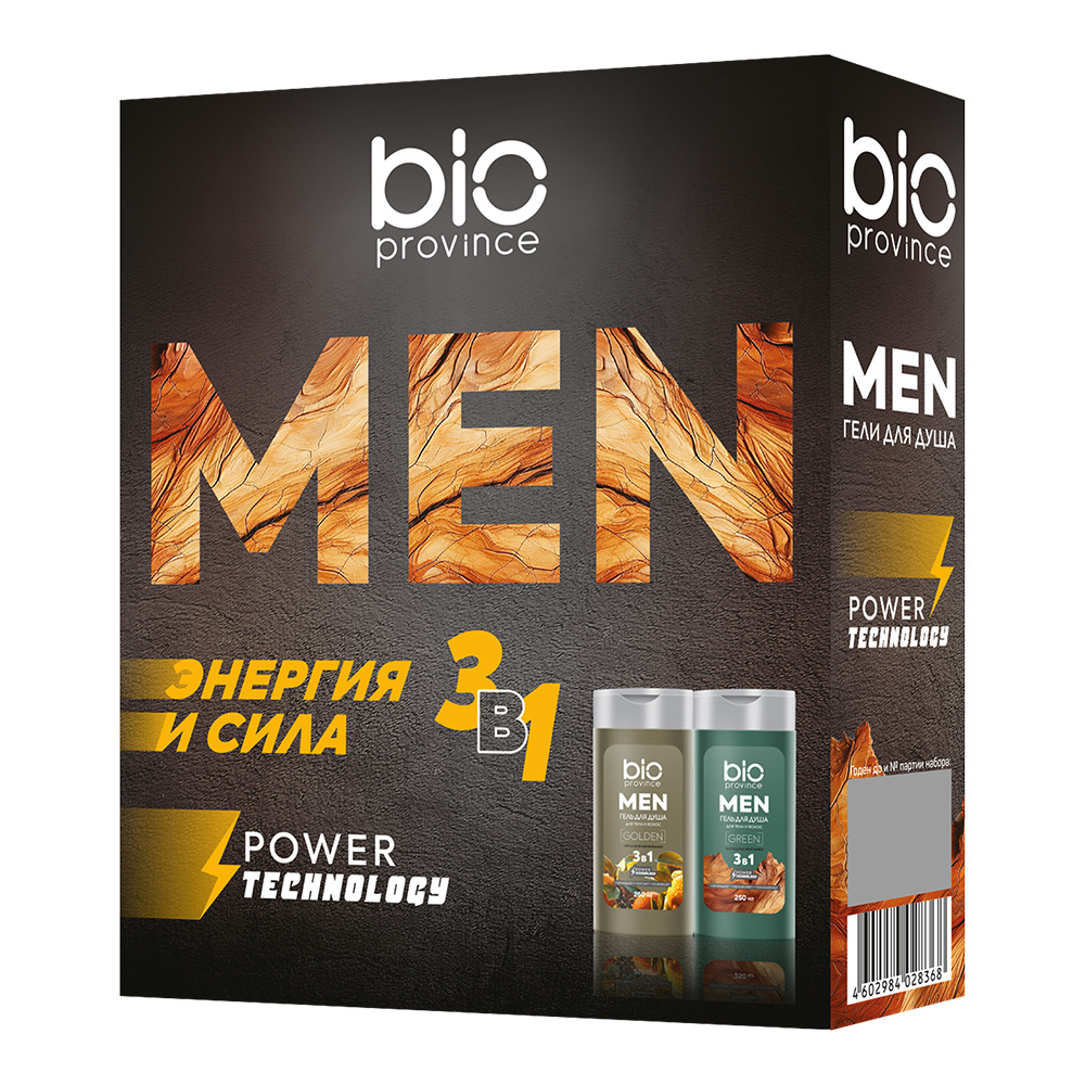 Набор подарочный BioProvince Энергия и сила MEN, 3 в 1 (гель для душа Golden 250 мл + Green 250мл), мужской