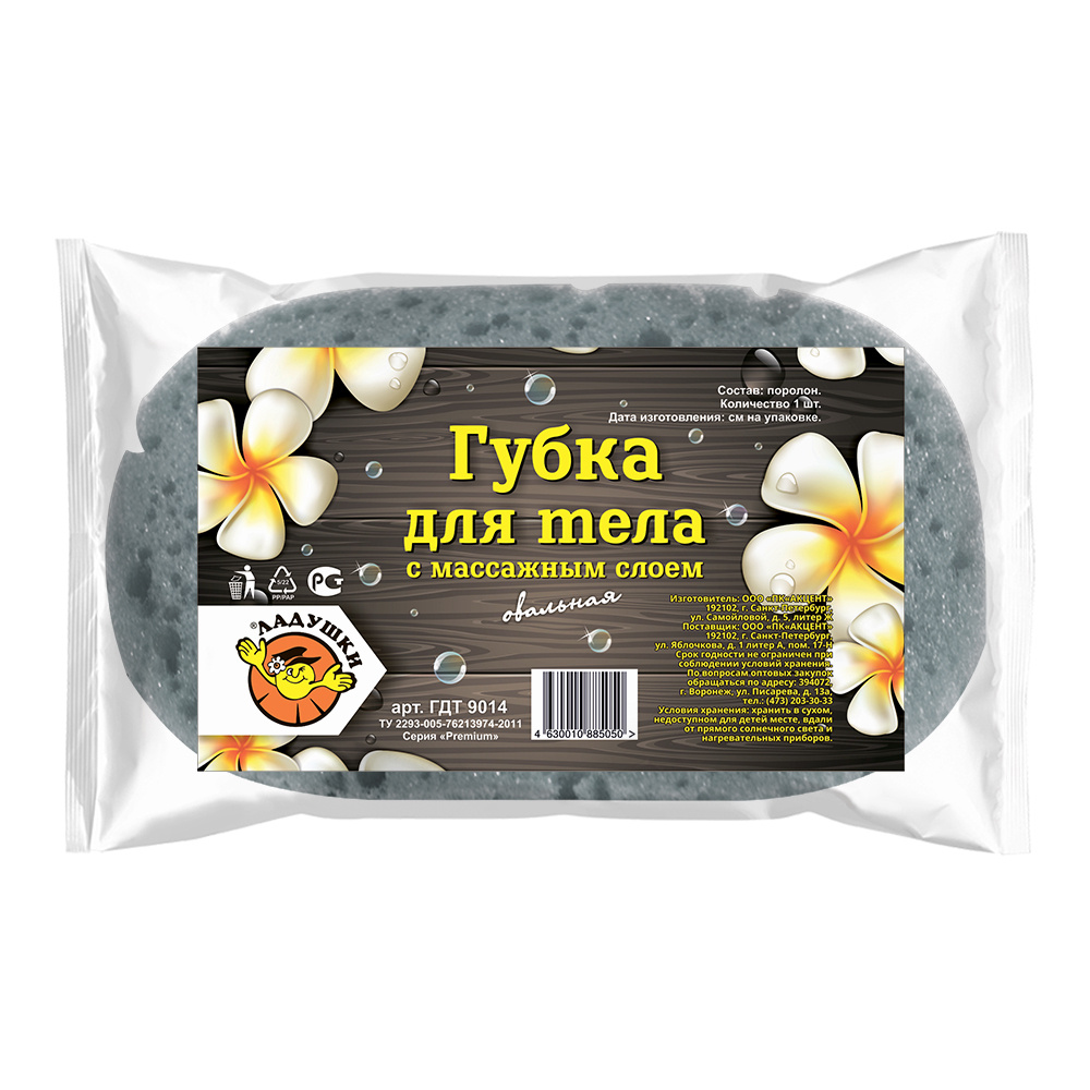 Губка для тела Ладушки ГДТ9014 с массажным слоем овальная, серый