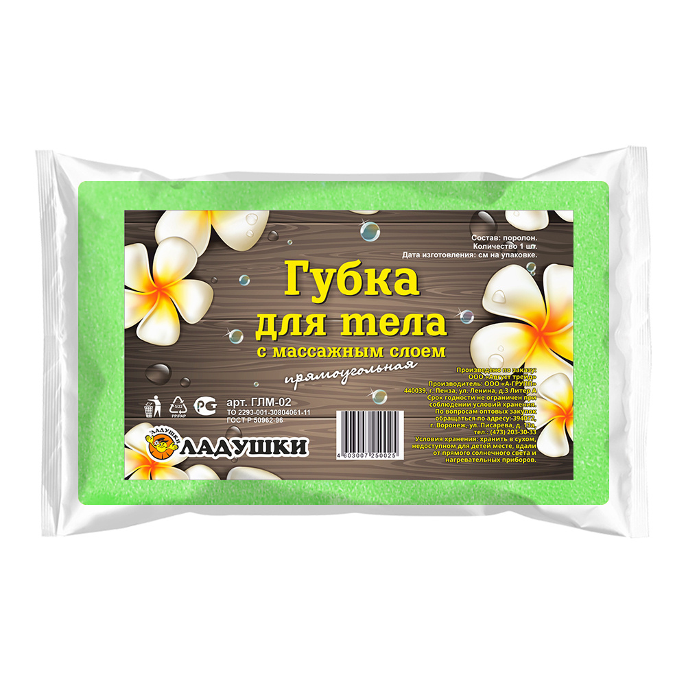 Губка для тела Ладушки ГЛМ-02 с массажным слоем прямоугольная, салатовый