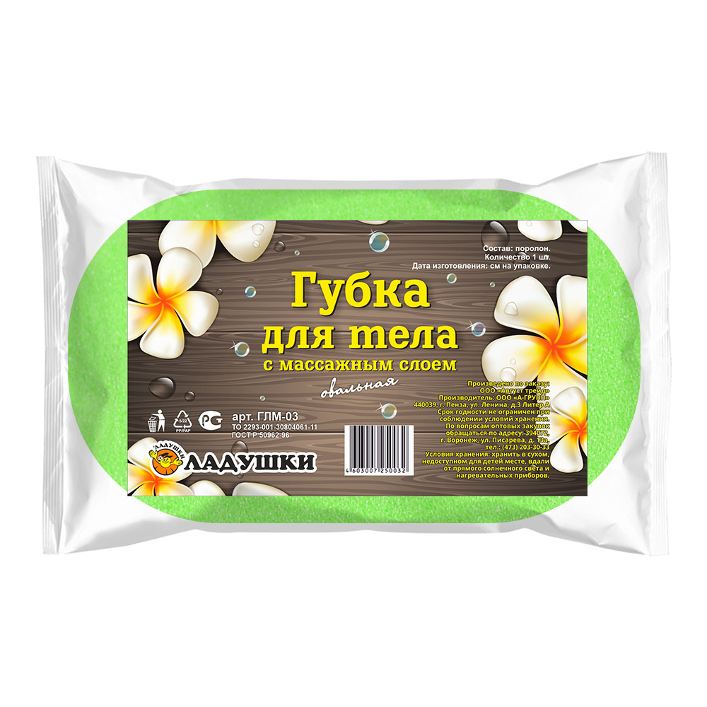 Губка для тела Ладушки ГЛМ-03 с массажным слоем овальная, салатовый