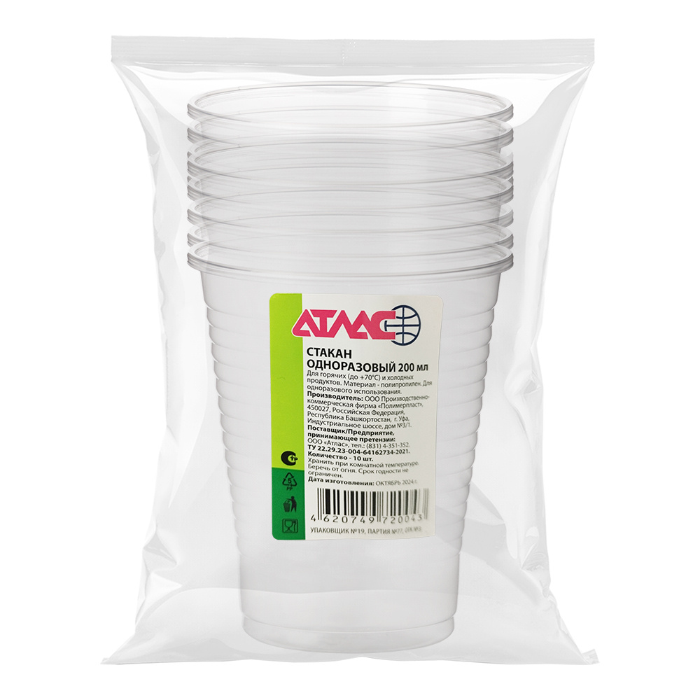 Одноразовая посуда стакан Атлас 0,2 мм, полипропилен, прозрачный, 10 шт