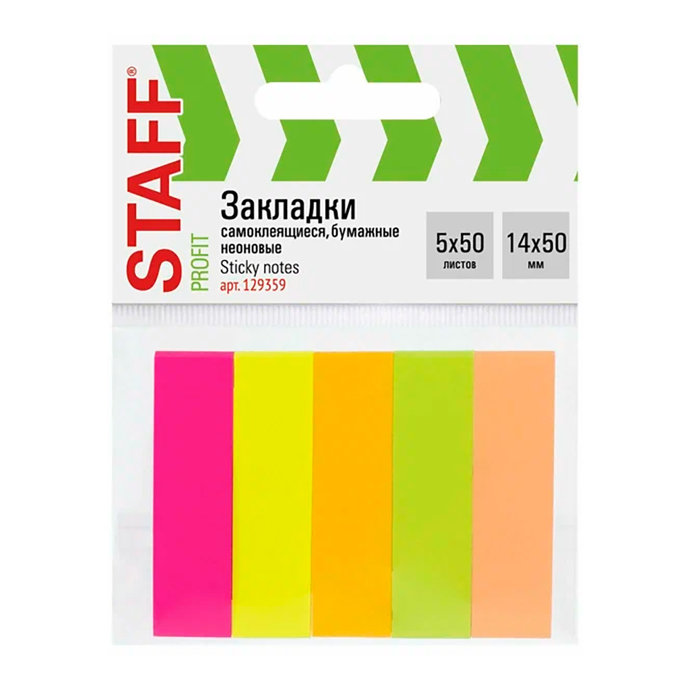 Канцелярские блок-закладки Staff 129359 с клеевым краем 5 цветов х 50 штук, неоновый 14 х 50 мм