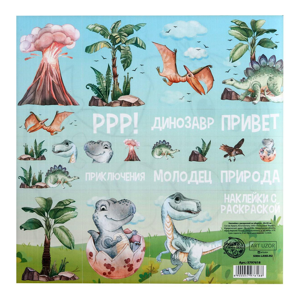 Наклейки 5797618 Динозаврики с раскраской на обороте 20*20 см