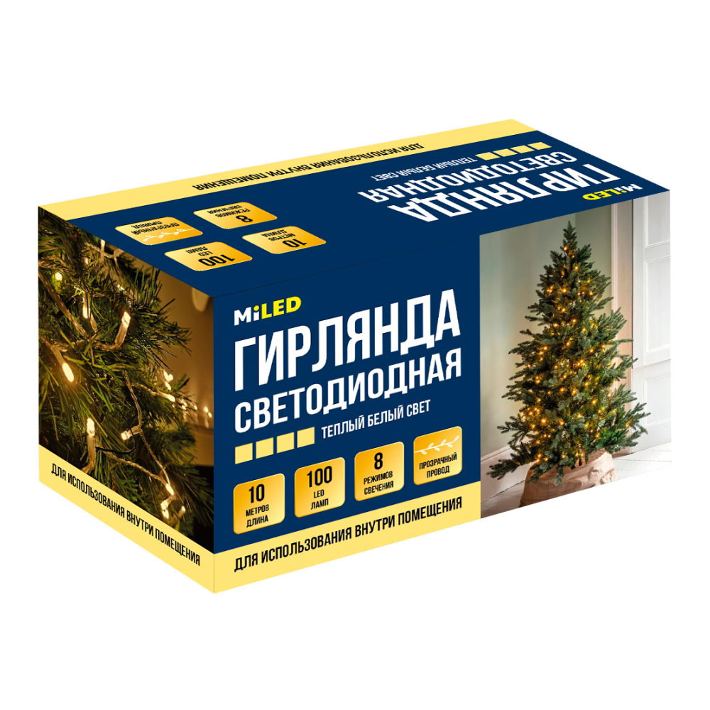 Новогодняя Гирлянда НУ-9728 светодиодная, метражная, 100 ламп, 8 режимов, теплый белый свет, 10 м