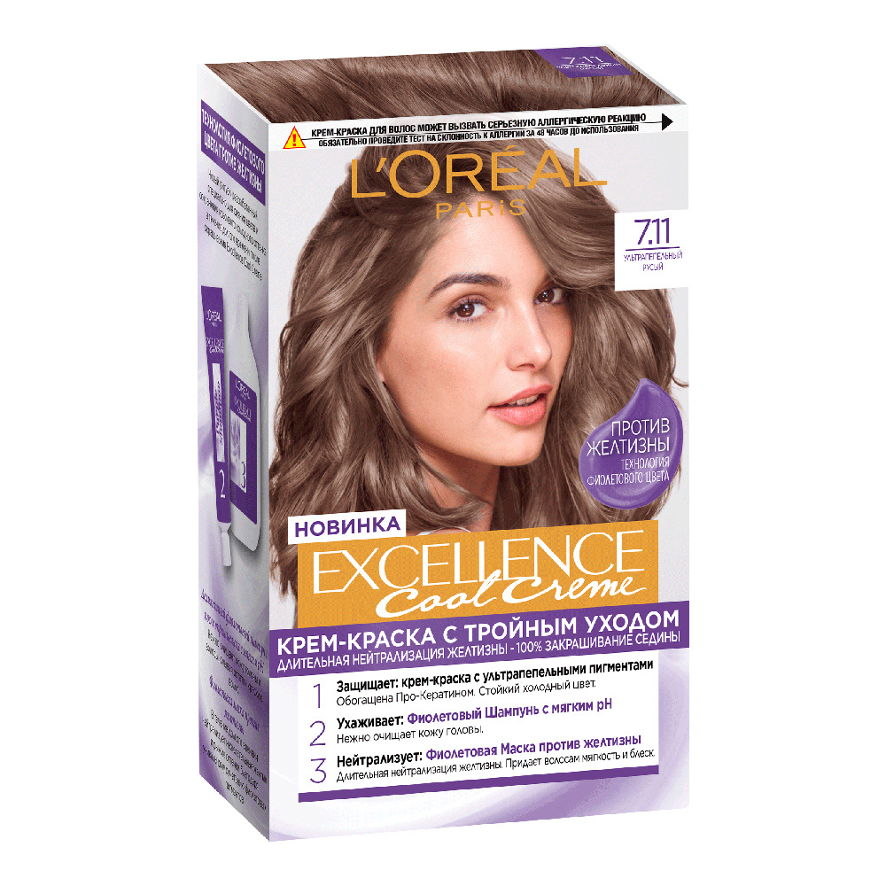 Краска для волос L'Oreal Excellence Creme без желтизны тон 7.11, ультрапепельный, русый, 192 мл