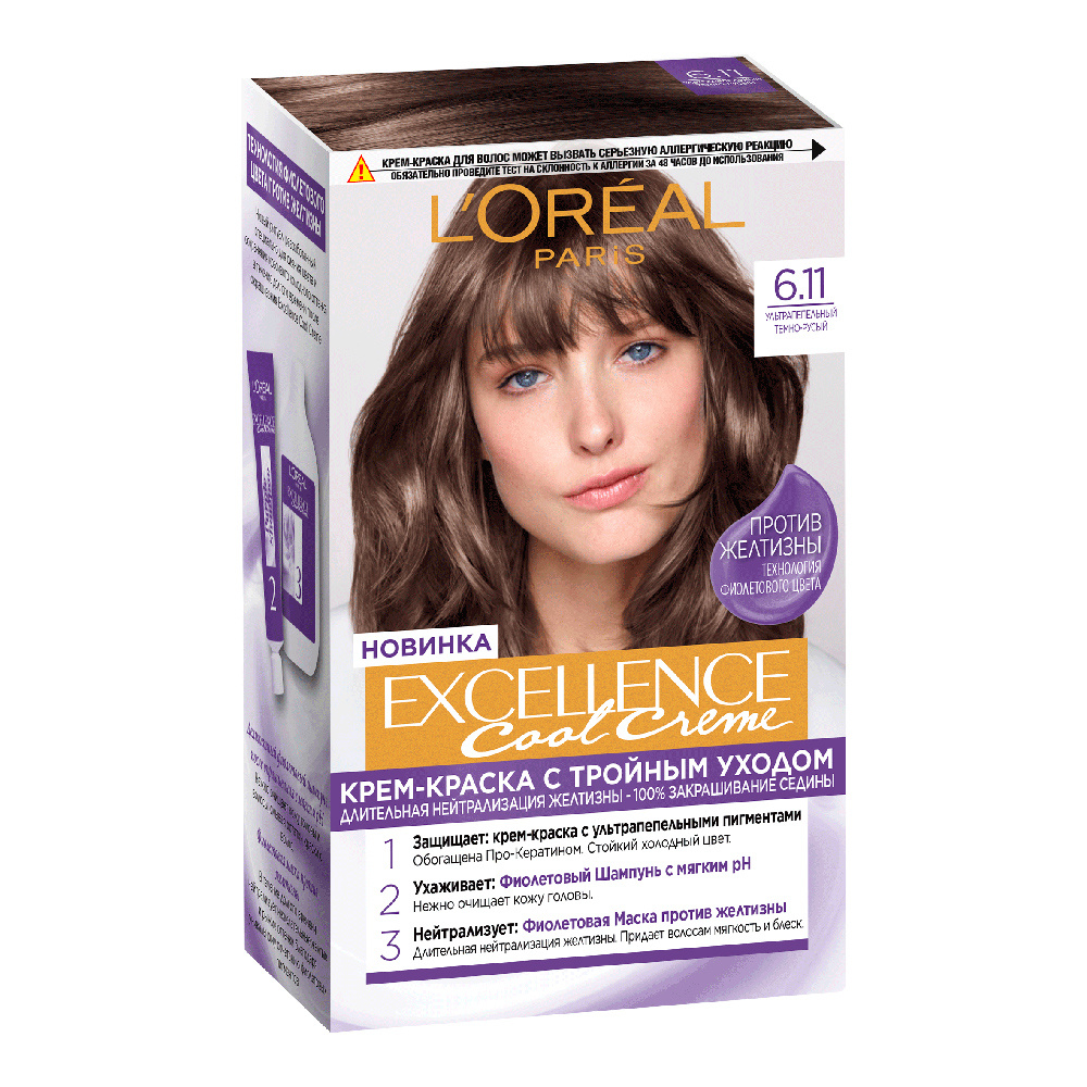 Краска для волос L'Oreal Excellence Creme без желтизны тон 6.11, ультрапепельный, темно-русый, 192 мл