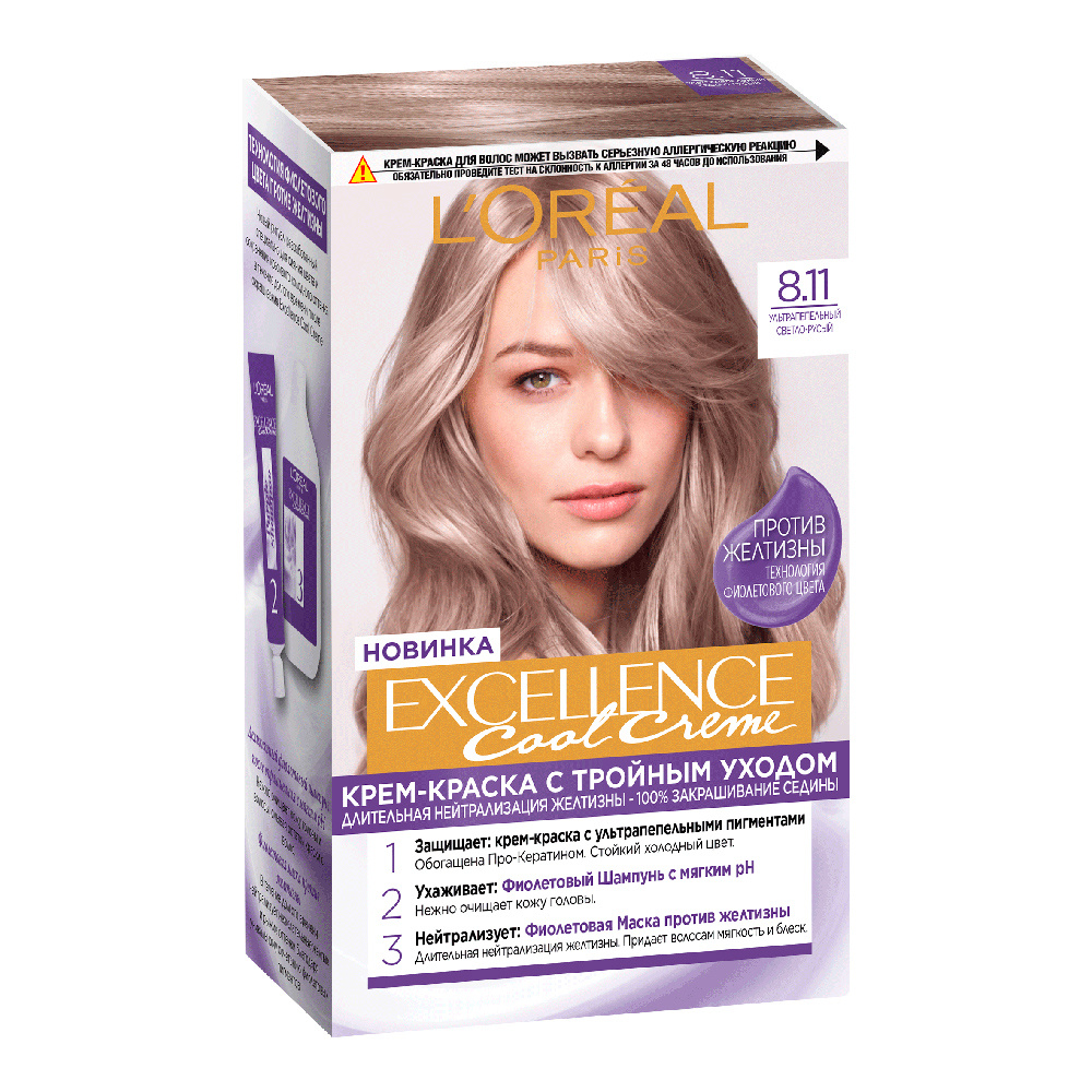 Краска для волос L'Oreal Excellence Creme без желтизны тон 8.11, ультра-пепельный светло-русый, 192 мл