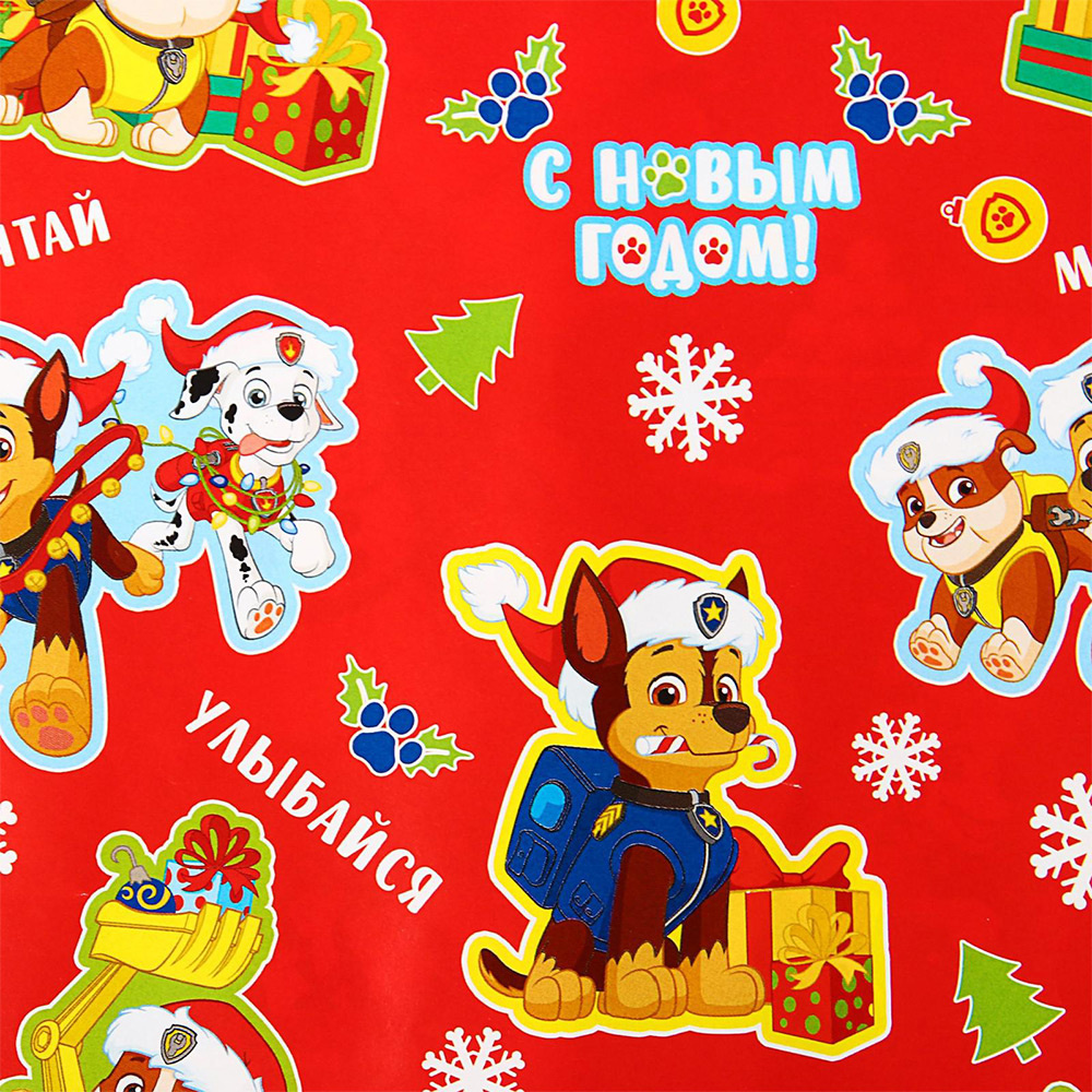 Бумага упаковочная 3399669 С Новым Годом, Щенячий патруль,глянцевая, 65г/м 50*70 см, красный